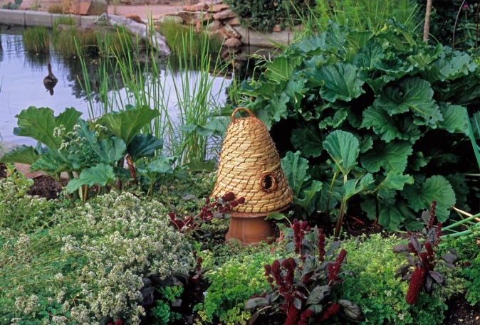 Rhubarb serves as a backdrop for low-growing herbs in the Denver Botanical Garden. The parsley and blooming oregano provide bright green accents against the red of the flowering amaranth and rhubarb stalks while the straw bee skep adds a rustic decorative touch.