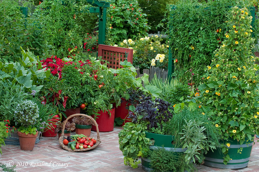 [caption id="attachment_694" align="aligncenter" width="900" caption="My containers are filled with special varieties of vegetables. In the large barrel there are plants of bush 'Henderson' lima beans climbing among the black-eyed-susan-vine, and a 'Super Bush' tomato overflows its container."][/caption].